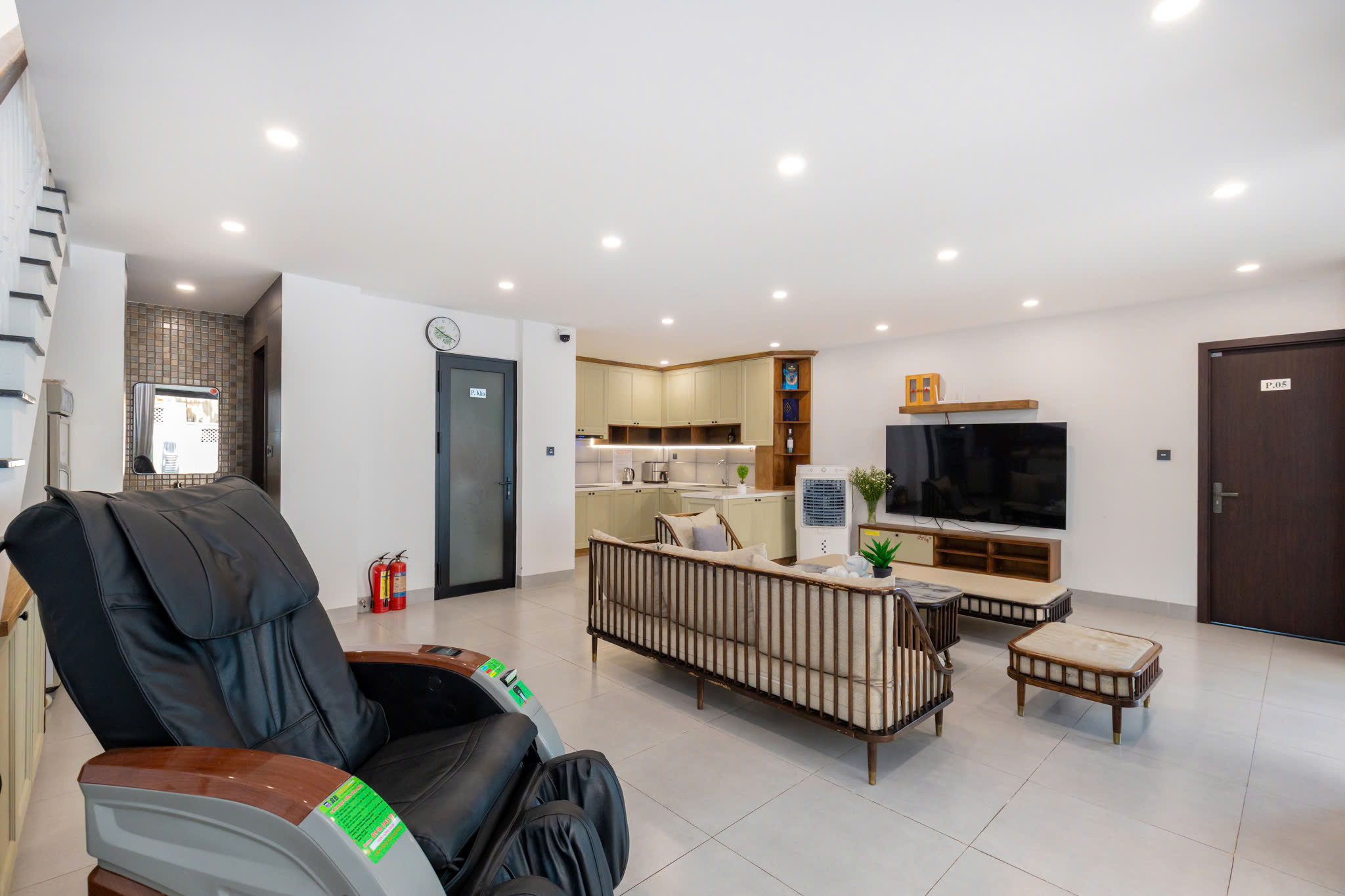 Hệ thống 6 toilet (5 phòng có toilet riêng) giúp đảm bảo sự riêng tư và tiện lợi cho tất cả khách lưu trú. Phòng khách rộng 40m², thiết kế sang trọng, thích hợp sinh hoạt chung hoặc tổ chức tiệc.